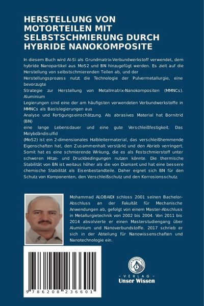 In diesem Buch wird Al-Si als Grundmatrix-Verbundwerkstoff verwendet, dem hybride Nanopartikel aus MoS2 und BN hinzugefügt werden. Es zielt auf die Herstellung von selbstschmierenden Teilen ab, und derHerstellungsprozess nutzt die Technologie der Pulvermetallurgie, eine bevorzugteStrategie zur Herstellung von Metallmatrix-Nanokompositen (MMNCs). AluminiumLegierungen sind eine der am häufigsten verwendeten Verbundwerkstoffe in MMNCs als Basislegierungen ausAnalyse und Fertigungseinschätzung. Als abrasives Material hat Bornitrid (BN)eine lange Lebensdauer und eine gute Verschleißfestigkeit. Das Molybdändisulfid(MoS2) ist ein 2-dimensionales Halbleitermaterial, das verschleißhemmende Eigenschaften hat, den Zusammenhalt verstärkt und den Abrieb verringert. Somit hat es eine schmierende Wirkung, die es als Festschmierstoff unter schweren Hitze- und Druckbedingungen nutzen könnte. Die thermische Stabilität von BN ist weitaus höher als die von Diamant und hat eine bessere chemische Stabilität als Eisenbestandteile. Daher eignet sich BN für den Schutz von Komponenten, den Verschleißschutz und den Korrosionsschutz.