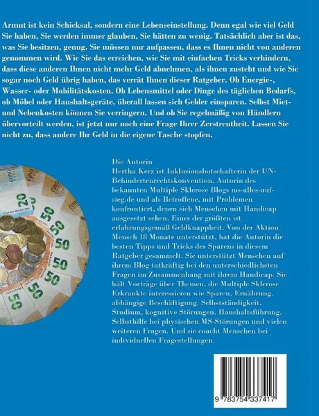 Weint auch in Ihrer Geldbörse der letzte Euro am Ende des Monats aus Einsamkeit? Oder tummeln sich wildfremde Euro auf Ihrem Konto, weil Sie es überziehen mussten - wieder einmal? Damit ist jetzt Schluss. Ab sofort gehen Sie einkaufen oder shoppen und erkennen auf den ersten Blick, ob der Händler Ihnen Qualität und ein geniales Angebot macht oder nur an seinen Profit denkt. Dieser Ratgeber zeigt Ihnen, wie sie problemlos sparen, ohne etwas zu vermissen. Ab sofort verringern Sie Ihre Ausgaben für Energie, Wasser und Mobilität oder variable Kosten wie den täglichen Einkauf und das Schoppen. Selbst Mietkosten lassen sich - mit ein wenig Aufwand - reduzieren. Ab sofort passen Sie Ihren Produktverbrauch Ihren echten Wünschen an. Ihren Wünschen, nicht den Wünschen der Händler, die ihren Schrott bei Ihnen abladen wollen. Nie mehr zu viel kaufen, zu viel ausgeben - und zu viel wegwerfen. Dieser Ratgeber zeigt Ihnen, wie Sie immer und überall Ihr Geld effektiv in Produkte investieren, die Ihnen einen echten Nutzen bringen. Produkte, an denen Sie sich erfreuen und die Sie unterstützen. Und er zeigt, wie Sie Produkte, die sie nicht brauchen, erkennen und wann Sie durch die Preisgestaltung der Händler übervorteilt werden. Sie sehen jederzeit, wann ein Angebot für Sie lukrativ ist. 'Hertha Kerz sagt - Armut muss nicht sein - Geld richtig verwalten, ist die Lösung in ein finanziell sorgenfreies Leben.