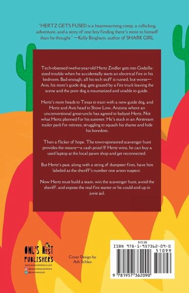 Tech-obsessed twelve-year-old Hertz Zindler gets into Godzilla-sized trouble when he accidentally starts an electrical fire in his bedroom. Bad enough, all his tech stuff is ruined, but worse-Avis, his mom's guide dog, gets grazed by a fire truck leaving the scene and the poor dog is traumatized and unable to guide. Hertz's mom heads to Texas to train with a new guide dog, and Hertz and Avis head to Show Low, Arizona where an unconventional great-uncle has agreed to babysit Hertz. Not what Hertz planned for his summer. He's stuck in an Airstream trailer park for retirees, struggling to squash his shame and hide his boredom. Then a flicker of hope. The town-sponsored scavenger hunt provides the means-a cash prize! If Hertz wins, he can buy a used laptop at the local pawn shop and get reconnected. But Hertz's past, along with a string of dumpster fires, have him labeled as the sheriff's number one arson suspect. Now Hertz must build a team, win the scavenger hunt, avoid the sheriff, and expose the real fire starter or he could end up in juvie jail.