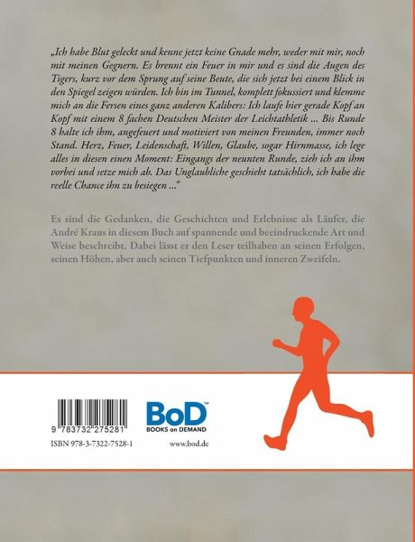 "Ich habe Blut geleckt und kenne jetzt keine Gnade mehr, weder mit mir, noch mit meinen Gegnern. Es brennt ein Feuer in mir und es sind die Augen des Tigers, kurz vor dem Sprung auf seine Beute, die sich jetzt bei einem Blick in den Spiegel zeigen würden. Ich bin im Tunnel, komplett fokussiert und klemme mich an die Fersen eines ganz anderen Kalibers: Ich laufe hier gerade Kopf an Kopf mit einem 8 fachen Deutschen Meister der Leichtathletik ... Bis Runde 8 halte ich ihm, angefeuert und motiviert von meinen Freunden, immer noch Stand. Herz, Feuer, Leidenschaft, Willen, Glaube, sogar Hirnmasse, ich lege alles in diesen einen Moment: Eingangs der neunten Runde, zieh ich an ihm vorbei und setze mich ab. Das Unglaubliche geschieht tatsächlich, ich habe die reelle Chance ihn zu besiegen ..."Es sind die Gedanken, die Geschichten und Erlebnisse als Läufer, dieAndre Kraus in diesem Buch auf spannende und beeindruckende Art und Weise beschreibt. Dabei lässt er den Leser teilhaben an seinenErfolgen, seinen Höhen, aber auch seinen Tiefpunkten und inneren Zweifeln.
