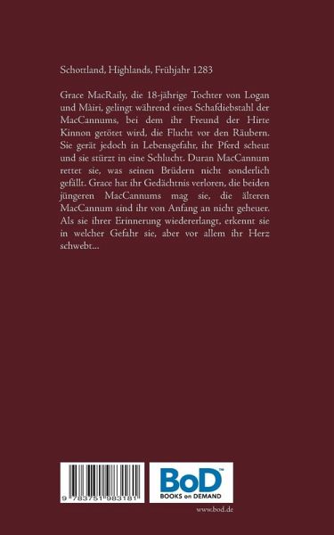 Schottland, Highlands, Frühjahr 1283Grace MacRaily, die 18-jährige Tochter von Logan und Màiri, gelingt während eines Schafdiebstahl der MacCannums, bei dem ihr Freund der Hirte Kinnon getötet wird, die Flucht vor den Räubern. Sie gerät jedoch in Lebensgefahr, ihr Pferd scheut und sie stürzt in eine Schlucht. Duran MacCannum rettet sie, was seinen Brüdern nicht sonderlich gefällt. Grace hat ihr Gedächtnis verloren, die beiden jüngeren MacCannums mag sie, die älteren MacCannum sind ihr von Anfang an nicht geheuer. Als sie ihrer Erinnerung wiedererlangt, erkennt sie in welcher Gefahr sie, aber vor allem ihr Herz schwebt...