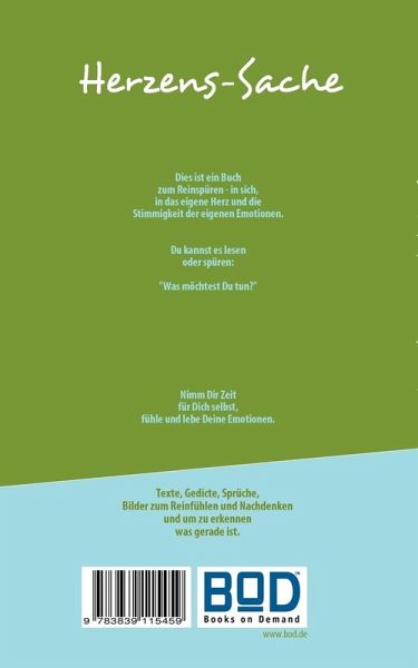 Das Buch zum ReinspürenEin Buch zum Reinspüren - in sich, in das eigene Herz und die Stimmigkeit der eigenen Emotionen. Nehmen Sie sich Zeit für sich selbst.Texte, Gedichte, Sprüche und Bilder zum Fühlen, Nachdenken und um zu erkennen, was gerade ist.Ein Geschenk für das Herz und die Stimmigkeit."Ein Buch kann man lesen oder erleben, was möchten Sie tun?"Dieses Buch ist für all diejenigen, die sich in dieser hektischen und oftmals schwierigen Zeit wieder einmal auf sich selbst und die wahren Werte dieses Lebens besinnen möchten. Ideal als kleines Geschenk für viele Situationen und Personengruppen, ob Familie, Freunde oder auch Geschäftspartner.