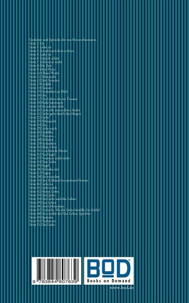 Gedichte und Sprüche die von Herzen kommen.Seite 2 IchSeite 3 Liebe istSeite 4 So nah und doch so fernSeite 5 Liebe istSeite 6 Einfach schönSeite 7 Ich bereue nichtSeite 8 Die ZeitSeite 9 Mein HerzSeite 10 Ohne WorteSeite 11 SehnsuchtSeite 12 Seit StundenSeite 13 GefühlSeite 14 EinsamSeite 15 Gedanken an DichSeite 16 DuSeite 17 Ein Leben wie im Traume Seite 18 Kalte JahreszeitSeite 19 Ich möchte dichSeite 20 Liebe die man schwer findetSeite 21 Liebe geht durch den MagenSeite 22 LiebeSeite 23 SehnsuchtSeite 24 Du...Seite 25 Liebe michSeite 26 GefühleSeite 27 Warum....Seite 28 SchlafenSeite 29 GedankenSeite 30 Mein HerzSeite 31 Leuchtende SterneSeite 32 Ein EngelSeite 33 Vermisse mich nichtSeite 34 Eine LiebeSeite 35 EngelSeite 36 Schenke mirSeite 37 FragenSeite 38 Ich wünschteSeite 39 Der Schlüssel zu meinem HerzenSeite 40 Liebe istSeite 41 Liebe michSeite 42 Meine LiebeSeite 43 Die LiebeSeite 44 Die Liebe und das LebenSeite 45 Das LebenSeite 46 Zwei MenschenSeite 47 Erwischt, Wo die Liebe hinfällt, Im SchlafSeite 48 Ich schicke dir, Das Leben, SprücheSeite 49 SprücheSeite 50 NachwortSeite 51 Die Liebe