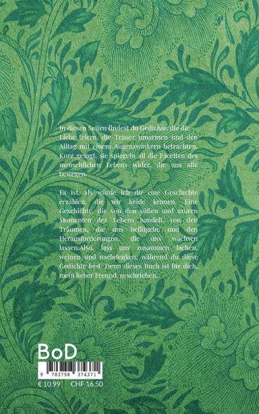 In diesen Seiten findest du Gedichte, die die Liebe feiern, die Trauer umarmen und den Alltag mit einem Augenzwinkern betrachten. Kurz gesagt, sie spiegeln all die Facetten des menschlichen Lebens wider, die uns alle bewegen.Es ist, als würde ich dir eine Geschichte erzählen, die wir beide kennen. Eine Geschichte, die von den süßen und sauren Momenten des Lebens handelt, von den Träumen, die uns beflügeln, und den Herausforderungen, die uns wachsen lassen. Also, lass uns zusammen lachen, weinen und nachdenken, während du diese Gedichte liest. Denn dieses Buch ist für dich, mein lieber Freund, geschrieben.