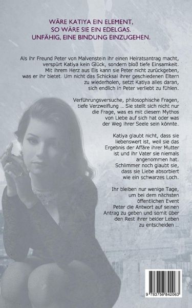 Der Versuch, die intuitive Weisheit des Herzens durch den Verstand zu kontrollieren, lässt am Ende nur einen gewinnen: Die Angst.Wäre Katiya ein Element, so wäre sie ein Edelgas. Unfähig, eine Bindung einzugehen. Als ihr Freund Peter von Malvenstein ihr einen Heiratsantrag macht, verspürt sie kein Glück, sondern bloß tiefe Einsamkeit. Mit ihrem Herz aus Eis kann sie Peter nicht zurückgeben, was er ihr bietet.Um nicht das Schicksal ihrer geschiedenen Eltern zu wiederholen, setzt Katiya alles daran, sich endlich in Peter verliebt zu fühlen. Verführungsversuche, philosophische Fragen, tiefe Verzweiflung... Sie stellt sich nicht nur die Frage, was es mit diesem Mythos von Liebe auf sich hat oder was der Weg ihrer Seele sein könnte. Katiya glaubt nicht, dass sie liebenswert ist, weil sie das Ergebnis der Affäre ihrer Mutter ist und ihr Vater sie niemals angenommen hat. Schlimmer noch glaubt sie, dass sie Liebe absorbiert wie ein schwarzes Loch.Ihr bleiben nur wenige Tage, um bei dem nächsten öffentlichen Event Peter die Antwort auf seinen Antrag zu geben und somit über den Rest ihrer beider Leben zu entscheiden...New Adult, Coming-Of-Age, Lebensfragen
