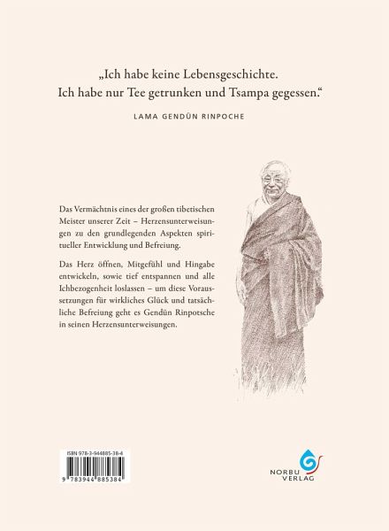 Das Vermächtnis eines der großen tibetischen Meister unserer Zeit. Herzensunterweisungen zu den grundlegenden Aspekten spiritueller Entwicklung und Befreiung. Das Herz öffnen, Mitgefühl und Hingabe entwickeln sowie tief entspannen und alle Ichbezogenheit loslassen - um diese Voraussetzungen für wirkliches Glück und tatsächliche Befreiung geht es Gendün Rinpoche in seinen Herzensunterweisungen. Es werden von ihm zentrale Aspekte unserer spirituellen Entwicklung erläutert wie Meditation, der Umgang mit Gefühlen, das Entwickeln von Mitgefühl, Hingabe und Weisheit, die spirituelle Beziehung von Lehrer und Schüler, die richtige Vorbereitung auf den Tod. Das Buch umfasst einen vollständigen Zyklus von Unterweisungen, wie er von Gendün Rinpoche zu Lebzeiten oft gegeben wurde. Neben einigen Gedichten und Fotos enthält es auch eine Beschreibung seines Lebensweges. 'Natürlich kann dieses Buch nur seine Worte wiedergeben und nicht seinen überraschend aufblitzenden Humor, sein freies Lachen, seinen unnachahmlich abwechselungsreichen Tonfall, seine treffsichere Mimik, die fließenden, vollendeten Gesten seiner Hände und auch nicht die Liebe, die aus seinen Augen strahlte. Doch seine Worte erleichtern uns - heute, wie zu seinen Lebzeiten - den Zugang zum Wesenskern der Lehre des Erwachens. Seine Worte sind einfach und tiefgründig zugleich. Sie kommen unmittelbar aus dem Herzen, aus dem reichen Schatz seiner persönlichen Erfahrung.'