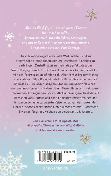 Weihnachtszauber in London! Ein gefühlvoller Roman über große Träume, ein Praktikum in London und unverhoffte GefühleDie achtzehnjährige Hanna liebt Weihnachten, und sie träumt schon lange davon, den 24. Dezember in London zu verbringen. Deshalb passt es mehr als perfekt, dass das Vorstellungsgespräch für ein Praktikum in ihrer Lieblingsstadt kurz vor den Feiertagen stattfinden soll. Aber vorher braucht Hanna erst mal das nötige Kleingeld für ihre Reise. Deshalb nimmt sie einen Job als Weihnachtselfe an. Blöderweise übertrifft Jared - der Weihnachtsmann, mit dem sie ein Team bilden soll - mit seiner mürrischen Art sogar den Grinch. Als Hanna ausgerechnet ihn auf dem Weg von Deutschland nach England wiedertrifft, beginnt für die beiden eine turbulente Reise. Im Schein der funkelnden Lichter Londons blickt Hanna hinter Jareds Fassade - und wider Erwarten fängt es zwischen den beiden an zu knistern ...