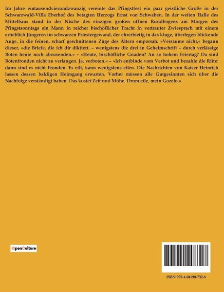 Im Jahre eintausendvierundzwanzig vereinte das Pfingstfest ein paar geistliche Große in der Schwarzwald-Villa Eberhof des betagten Herzogs Ernst von Schwaben. In der weiten Halle des Mittelbaus stand in der Nische des einzigen großen offnen Rundbogens am Morgen des Pfingstsonntags ein Mann in reicher bischöflicher Tracht in vertrauter Zwiesprach mit einem erheblich Jüngeren im schwarzen Priestergewand, der ehrerbietig in das kluge, überlegen blickende Auge, in die feinen, scharf geschnittenen Züge des Ältern emporsah. »Versäume nicht,« begann dieser, »die Briefe, die ich dir diktiert, ¿ wenigstens die drei in Geheimschrift ¿ durch verlässige Boten heute noch abzusenden.« ¿ »Heute, bischöfliche Gnaden? An so hohem Feiertag? Da sind Botenfronden nicht zu verlangen. Ja, verboten.« ¿ »Ich entbinde vom Verbot und bezahle die Ritte: dann sind es nicht Fronden. Es eilt, kann wenigstens eilen. Die Nachrichten von Kaiser Heinrich lassen dessen baldigen Heimgang erwarten. Vorher müssen alle Gutgesinnten sich über die Nachfolge verständigt haben. Das kostet Zeit und Mühe. Drum eile, mein Gozelo.«