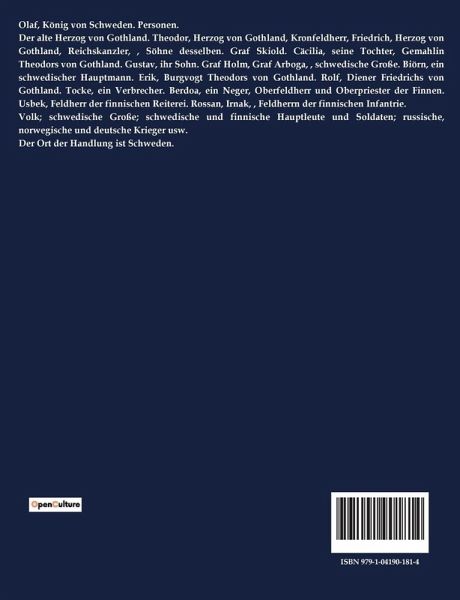 Olaf, König von Schweden. Personen. Der alte Herzog von Gothland. Theodor, Herzog von Gothland, Kronfeldherr, Friedrich, Herzog von Gothland, Reichskanzler, , Söhne desselben. Graf Skiold. Cäcilia, seine Tochter, Gemahlin Theodors von Gothland. Gustav, ihr Sohn. Graf Holm, Graf Arboga, , schwedische Große. Biörn, ein schwedischer Hauptmann. Erik, Burgvogt Theodors von Gothland. Rolf, Diener Friedrichs von Gothland. Tocke, ein Verbrecher. Berdoa, ein Neger, Oberfeldherr und Oberpriester der Finnen. Usbek, Feldherr der finnischen Reiterei. Rossan, Irnak, , Feldherrn der finnischen Infantrie. Volk; schwedische Große; schwedische und finnische Hauptleute und Soldaten; russische, norwegische und deutsche Krieger usw. Der Ort der Handlung ist Schweden.