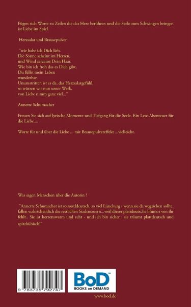 Fügen sich Worte zu Zeilen, die das Herz berühren und die Seele zum Schwingen bringen, ist Liebe im Spiel. Herzsalat und Brausepulver"wie habe ich Dich lieb.Die Sonne scheint im Herzen,und Wind zerzaust Dein Haar.Wie bin ich frohdas es Dich gibt, Du füllst mein Lebenwunderbar.Unumstritten ist es da,das Herzsalatgefühl,so würzen wir nun unser Werk,von Liebe nimm ganz viel...Annette SchumacherFreuen Sie sich auf lyrische Momente und Tiefgang für die Seele.Ein Lese-Abenteuer für die Liebe... Worte für und über die Liebe... Herzhüpfer