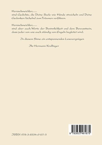Herzschmeichler,.... sind Gedichte, die Deine Seele wie Hände streicheln, Deine Gedanken lächelnd zum Träumen verführen. Aber auch Worte der Besinnlichkeit und sanfte Seelentröster !!!