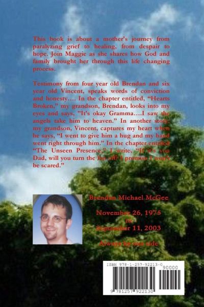 This book is about a mother's journey from paralyzing grief to healing, from despair to hope. Join Maggie, as she shares how God and family brought her through this life changing process. Testimony from four year old Brendan and six year old Vincent, speaks words of conviction and honesty.... In the chapter entitled, "Hearts Broken," my grandson, Brendan, looks into my eyes and says, "It's okay Gramma....I saw the angels take him to heaven." In another story, my grandson, Vincent, captures my heart when he says, "I went to give him a hug and my hand went right through him." In the chapter entitled "The Unseen Presence," I write, "If it's you Dad, will you turn the fan off? I promise I won't be scared."