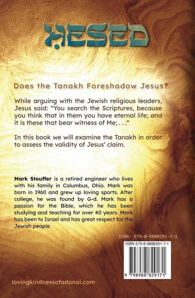 WHILE arguing with the Jewish religious leaders, Jesus said, "You search the Scriptures, because you think that in them you have eternal life; and it is these that bear witness of Me; . . ." In this series of books we will examine the Tanakh in order to see if Jesus' claim has any merit. In Hesed we will consider if the sacrificial system prescribed in the Torah prefigures Jesus' death on the cross. We will do so by asking such root level questions as: Why did the Jews need to sacrifice lambs at the first Passover in order to be exempt from G-d's judgement? After all, they were the victims in this event of slavery and oppression. Why did the High Priest need to immediately exit G-d's presence once he sprinkled the blood in the Holy of Holies? Didn't the blood atone for his sins on Yom Kippur? et.al. We will also examine the lives of Joseph, Moses, David, and Daniel. For, there are some noticeable similarities between their lives and Jesus' life. The question is, were these details purposely inserted in the Tanakh to foreshadow Jesus, or is this just a coincidence? Join author Mark Stouffer as he seeks to understand the intended meaning of the Biblical authors. Hesed is for Jewish people who want to know the truth about Jesus. It is also good for Christians who want to learn about the Tanakh, or Old Testament.