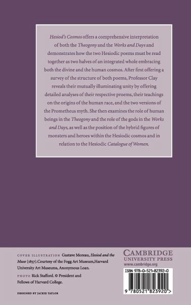 Hesiod's Cosmos offers a comprehensive interpretation of both the Theogony and the Works and Days and demonstrates how the two Hesiodic poems must be read together as two halves of an integrated whole embracing both the divine and the human cosmos. After first offering a survey of the structure of both poems, Professor Clay reveals their mutually illuminating unity by offering detailed analyses of their respective poems, their teachings on the origins of the human race and the two versions of the Prometheus myth. She then examines the role of human beings in the Theogony and the role of the gods in the Works and Days, as well as the position of the hybrid figures of monsters and heroes within the Hesiodic cosmos and in relation to the Hesiodic Catalogue of Women.