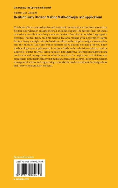 This book offers a comprehensive and systematic introduction to the latest research on hesitant fuzzy decision-making theory. It includes six parts: the hesitant fuzzy set and its extensions, novel hesitant fuzzy measures, hesitant fuzzy hybrid weighted aggregation operators, hesitant fuzzy multiple-criteria decision-making with incomplete weights, hesitant fuzzy multiple criteria decision-making with complete weights information, and the hesitant fuzzy preference relation based decision-making theory. These methodologies are implemented in various fields such as decision-making, medical diagnosis, cluster analysis, service quality management, e-learning management and environmental management. A valuable resource for engineers, technicians, and researchers in the fields of fuzzy mathematics, operations research, information science, management science and engineering, it can also be used as a textbook for postgraduate and senior undergraduate students.
