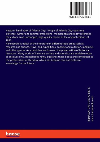 Heston's hand book of Atlantic City: - Origin of Atlantic City--seashore sketches--winter and summer attractions--memoranda and ready reference for visitors. is an unchanged, high-quality reprint of the original edition of 1897. Hansebooks is editor of the literature on different topic areas such as research and science, travel and expeditions, cooking and nutrition, medicine, and other genres. As a publisher we focus on the preservation of historical literature. Many works of historical writers and scientists are available today as antiques only. Hansebooks newly publishes these books and contributes to the preservation of literature which has become rare and historical knowledge for the future.