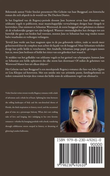 Bekroonde auteur Violet Sinclair presenteert Het Geheim van haar Burggraaf, een historische roman die zich afspeelt in de wereld van The Duchess Diaries. In het Engeland van de Regency-periode droomt Jane Seymour ervan haar illustraties van zeldzame vogels te publiceren, maar maatschappelijke verwachtingen dreigen haar vleugels te kortwieken. Dan ontmoet ze Sebastian Westwood, de norse burggraaf met geheimen zo duister als de schaduwrijke gangen van zijn landgoed. Wanneer omstandigheden hen dwingen tot een huwelijk dat geen van beiden had voorzien, moeten Jane en Sebastian hun weg vinden tussen halve waarheden en verborgen verlangens. Terwijl Jane werkt aan haar magnum opus in de pas gebouwde volière, raakt ze steeds meer gefascineerd door de complexe man achter de façade van de burggraaf. Maar Sebastians verleden dreigt hun prille liefde te verscheuren. Met Anabelle, Sebastians jonge pupil, gevangen tussen hen in, moet Jane beslissen of liefde het risico van een gebroken hart waard is. Te midden van het gefladder van zeldzame vogels en het geritsel van schetspapier, kunnen Jane en Sebastian een liefde opbouwen die elke storm kan doorstaan? Of zullen de geheimen van Westwood Manor hen uit elkaar drijven? Het Geheim van haar Burggraaf is een meeslepende Regency-romance die fans van Julia Quinn en Lisa Kleypas zal betoveren. Met een unieke mix van artistieke passie, familiegeheimen en tedere romantiek bewijst deze roman dat liefde soms de zeldzaamste vogel van allemaal is.