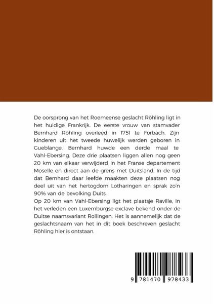 De oorsprong van het Roemeense geslacht Röhling ligt in het huidige Frankrijk. De eerste vrouw van stamvader Bernhard Röhling overleed in 1751 te Forbach. Zijn kinderen uit het tweede huwelijk werden geboren in Gueblange. Bernhard huwde een derde maal te Vahl-Ebersing. Deze drie plaatsen liggen allen nog geen 20 km van elkaar verwijderd in het Franse departement Moselle en direct aan de grens met Duitsland. In de tijd dat Bernhard daar leefde maakten deze plaatsen nog deel uit van het hertogdom Lotharingen en sprak zo'n 90% van de bevolking Duits. Op 20 km van Vahl-Ebersing ligt het plaatsje Raville, in het verleden een Luxemburgse exclave bekend onder de Duitse naamsvariant Rollingen. Het is aannemelijk dat de geslachtsnaam van het in dit boek beschreven geslacht Röhling hier is ontstaan.