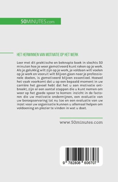 Leer met dit praktische en beknopte boek in slechts 50 minuten hoe je weer gemotiveerd kunt raken op je werk. Als je gelukkig wilt zijn op je werk, je voldaan wilt voelen op je werk en vooruit wilt blijven gaan naar je professionele doelen, is gemotiveerd blijven essentieel. Hoewel het vaak voorkomt dat u op een bepaald moment in uw carrière het gevoel hebt dat het u aan motivatie ontbreekt, zijn er een aantal stappen die u kunt nemen om weer op het goede spoor te komen: inzicht in de factoren die uw motivatie ondermijnen, een evaluatie van uw beroepservaring tot nu toe en een evaluatie van uw inzet voor uw organisatie kunnen u allemaal helpen om voldoening en plezier te vinden in wat u doet. In dit boek leert u hoe het hervinden van uw motivatie op het werk u niet alleen kan helpen in uw carrière, maar ook in uw persoonlijke leven. Het bevat ook nuttige tips om erachter te komen wat u werkelijk motiveert en advies om met uitdagende of stressvolle situaties om te gaan, zodat u in een mum van tijd weer plezier in uw werk krijgt!