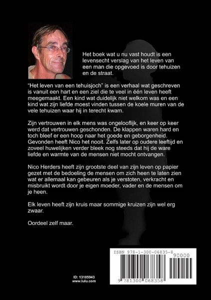 "Het leven van een tehuisjoch" is een verhaal wat geschreven is vanuit een hart en een ziel die te veel in één leven heeft meegemaakt. Een kind wat duidelijk niet welkom was en een kind wat zijn liefde moest vinden tussen de koele muren van de vele tehuizen waar hij in terecht kwam. Zijn vertrouwen in elk mens was ongelooflijk, en keer op keer werd dat vertrouwen geschonden. De klappen waren hard en toch bleef er een hoop naar het goede en geborgenheid. Gevonden heeft Nico het nooit. Zelfs later op oudere leeftijd en zoveel huwelijken verder bleek nog steeds dat hij de ware liefde en warmte van de mensen niet mocht ontvangen. Nico Herders heeft zijn grootste deel van zijn leven op papier gezet met de bedoeling de mensen om zich heen te laten zien wat er allemaal kan gebeuren als je verstoten, verkracht en misbruikt wordt door je eigen moeder, vader en de mensen om je heen. Elk leven heeft zijn kruis maar sommige kruizen zijn wel erg zwaar. Oordeel zelf maar.