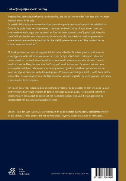 Vraagsturing, ontbureaucratisering, marktwerking: het zijn de 'pluswoorden' van deze tijd. Het moet allemaal anders in de zorg. De praktijk blijkt echter vaak weerbarstiger te zijn dan de hoopvolle beschouwingen uit het beleidscircuit. Ondanks de grote inzet van hulpverleners, managers en beleidsmakers hangt er een sluier van onvervulde verwachtingen over de sector en heerst er het beeld van een stroef lopend spel. Gaat die stroefheid niet ten koste van het plezier, de motivatie en de creativiteit van veel zorgverleners en andere betrokkenen en beïnvloedt dit de uiteindelijk geleverde prestaties? Hoe ontstaat deze stroefheid en kunnen we er wat aan doen?Dit boek probeert een aanzet tot kritische reflectie te geven. De auteur gaat op zoek naar de onderliggende rationaliteit van de sector, zoals de hybriditeit, het voortdurend balanceren tussen markt en overheid, de collegialiteit in een wereld waarin niemand echt de baas is en de 'handicaps' van de Haagse arena, waar het 'zorgspel' wordt ontworpen. De auteur hanteert een interessante metafoor: hebben we voor de zorg wel een goed en speelbaar spel ontworpen en wordt dat afgesproken spel wel adequaat gespeeld? Simpele oplossingen hoeft de lezer in dit boek niet te verwachten. De complexiteit en de lastige dilemma's van de zorgsector zijn een gegeven. We zullen ermee moeten leren omgaan.