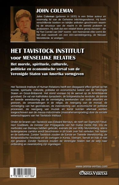 Het Tavistock Institute for Human Relations heeft een diepgaand effect gehad op het morele, spirituele, culturele, politieke en economische beleid van de Verenigde Staten van Amerika en Groot-Brittannië. Het stond vooraan bij de aanval op de Amerikaanse grondwet. Geen enkele groep produceerde meer propaganda om de Verenigde Staten aan te moedigen om deel te nemen aan de Eerste Wereldoorlog op een moment dat de meerderheid van het Amerikaanse volk daar tegen was. Dezelfde tactieken werden door de sociale wetenschappers van Tavistock gebruikt om de VS in de Tweede Wereldoorlog, Korea, Vietnam, Servië en de twee oorlogen tegen Irak te krijgen. Tavistock begon als een organisatie voor het maken en verspreiden van propaganda in Wellington House, Londen, in de aanloop naar de Eerste Wereldoorlog, wat Toynbee "dat zwarte gat van desinformatie" noemde. Bij een andere gelegenheid beschreef Toynbee Wellington House als een "fabriek van leugens". Vanuit een ietwat rudimentair begin groeide Wellington House uit tot het Tavistock Instituut en gaf het op zeer controversiële wijze vorm aan het lot van Duitsland, Rusland, Groot-Brittannië en de Verenigde Staten. De mensen in deze landen waren zich er niet van bewust dat ze werden "gehersenspoeld". De oorsprong van 'mind control', 'innerlijke sturende conditionering' en massaal 'hersenspoelen' wordt uitgelegd in een gemakkelijk te begrijpen boek dat met grote autoriteit is geschreven. De val van de katholieke dynastieën, de bolsjewistische revolutie, de Eerste en Tweede Wereldoorlog die de vernietiging betekenden van oude allianties en grenzen, de omwentelingen in de religie, het verval van de moraal, de vernietiging van het gezinsleven, de ineenstorting van de economische en politieke processen, de decadentie in muziek en kunst kunnen allemaal worden toegeschreven aan de massa-indoctrinatie (massahersenspoeling) door de sociale wetenschappers van het Tavistock Instituut. Onder de leden van de Tavistock faculteit bevond zich Edward Bernays, de neef van Sigmund Freud. Er wordt gezegd dat Herr Goebbels, minister van Propaganda van het Duitse Derde Rijk, gebruik maakte van de methoden van Bernays en van Willy Munzenberg, wiens buitengewone carrière wordt beschreven in dit boek over het verleden, het heden en de toekomst. Zonder Tavistock waren er geen Eerste en Tweede Wereldoorlog geweest, geen Bolsjewistische revolutie, geen oorlogen in Korea, Vietnam, Servië en Irak. Zonder Tavistock zouden de Verenigde Staten niet op weg zijn naar ontbinding en ineenstorting.