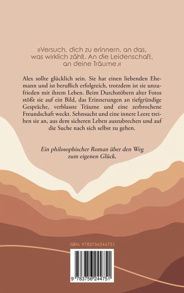 »Man muss sich verlieren, um sich wieder zu finden.«Obwohl Alex alles im Leben hat, um glücklich zu sein, ist sie unzufrieden. Der Job als erfolgreiche Projektleiterin erfüllt sie nicht und die Ehe hatte auch schon bessere Zeiten. Als ihr ein altes Foto in die Hände fällt, werden Erinnerungen wach an längst vergessene Träume und eine einst innige Freundschaft. Sehnsucht nach tiefgründigen Gesprächen und eine innere Leere ermutigen sie, aus ihrem eintönigen Alltag zu entfliehen und auf den Spuren ihrer Vergangenheit zu sich selbst zurückzufinden. Auf der Reise trifft sie unerwartet auf den geheimnisvollen Leo, der eine philosophische Art hat und zu ihrem Weggefährten wird. Wird Alex mit seiner Hilfe es schaffen, das Leben aus einem neuen Blickwinkel zu sehen?Ein spirituell-philosophischer Entwicklungsroman über den Weg zum eigenen Glück, der zum Nachdenken anregt und ein einzigartiges Geschenk für jeden Anlass bietet. Das ideale Geschenk, das Herzen berührt und Seelen inspiriert.