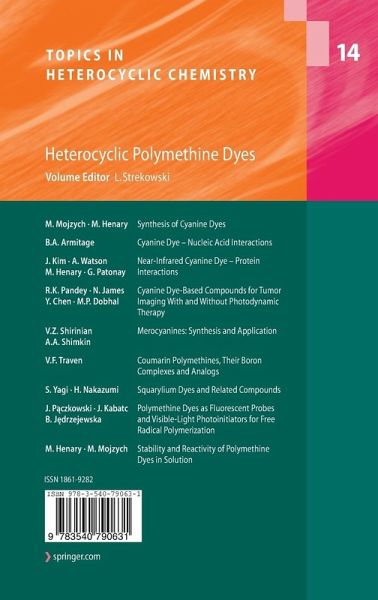 This treatise pertains to dyes composed of a central polymethine moiety and two cyclic terminal subunits. The polymethine linker can be unsubstituted or substituted, and at least one terminal subunit is a heterocyclic system. The classes of compounds reviewed range from classical cyanines, ?rst s- thesized in the 1850s, to hemicyanines, to styryl dyes, to merocyanines, to coumarinpolymethines, andtosquarylium dyesthatweresynthesized forthe ?rst time in the 1960s. These structurally diverse classes of compounds have one commondenominator, namely electronconjugation that involves the t- minalheterocyclic/aromaticsubunitsandthecentralpolymethinelinkerofthe molecule. Such conjugated molecules show absorption and ?uorescence that are a function of the structure of the three moieties. By changing the length and substitution of the polymethine linker and/or the structures of the t- minal moieties, molecules can be designed with absorption and ?uorescence ranging from the blue visible region ( 400nm) to the near-infrared region ( 700nm) of the electromagnetic spectrum. The synthetic developments of the last decade are reviewed and references to older but important work are provided tohelpdesignadye ofinterest fora desired speci?c application. It is the?uorescencepropertiesthataremostimportantforalargearrayofmodern applications of the dyes, especially in biotechnology. Some of the applications are clearly visible from the titles of the individual chapters, and additional featurescanbefounduponinspectionofthecorrespondingtablesofcontents. The subject index should be consulted for other properties and applications of the dyes that could not be elaborated on extensively in this relatively short reviewbook. Theauthorstookexcellentcareofsuchinformationbyproviding leading references on the additional subjects. I wish to thank the authors for their outstanding contributions. Thanks are also due to Ms. Birgit Kollmar- ThoniofSpringerandMs.