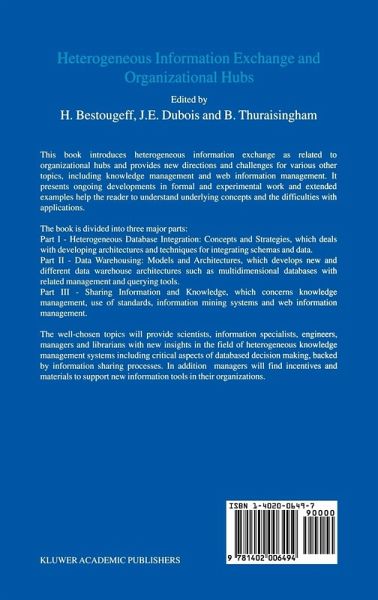 Helene Bestougeff, Universite de Marne Ia Vallee, France Jacques-Emile Dubois, Universite Paris VII-Denis Diderot, France Bhavani Thuraisingham, MITRE Corporation, USA The last fifty years promoted the conceptual trio: Knowledge, Information and Data (KID) to the center of our present scientific technological and human activities. The intrusion of the Internet drastically modified the historical cycles of communication between authors, providers and users. Today, information is often the result of the interaction between data and the knowledge based on their comprehension, interpretation and prediction. Nowadays important goals involve the exchange of heterogeneous information, as many real life and even specific scientific and technological problems are all interdisciplinary by nature. For a specific project, this signifies extracting information, data and even knowledge from many different sources that must be addressed by interoperable programs. Another important challenge is that of corporations collaborating with each other and forming coalitions and partnerships. One development towards achieving this challenge is organizational hubs. This concept is new and still evolving. Much like an airport hub serving air traffic needs, organizational hubs are central platforms that provide information and collaboration specific to a group of users' needs. Now companies are creating hubs particular to certain types of industries. The users of hubs are seen as communities for which all related information is directly available without further searching efforts and often with value-added services.