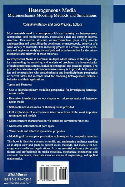 Most materials used in contemporary life and industry are heterogeneous (composites) and multicomponent, possessing a rich and complex internal structure. This internal structure, or microstructure, plays a key role in understanding and controlling the continuum behavior, or macroscopic, of a wide variety of materials. The modeling process is a critical tool for scientists and engineers studying the analysis and experimentation for the micromechanics and behavior of these materials. "Heterogeneous Media" is a critical, in-depth edited survey of the major topics surrounding the modeling and analysis of problems in micromechanics of multicomponent systems, including conceptual and practical aspects. The goal of this extensive and comprehensive survey is to provide both specialists and nonspecialists with an authoritative and interdisciplinary perspective of current ideas and methods used for modeling heterogeneous materials behavior and their applications. Topics and Features: _ all chapters use interdisciplinary modeling perspective for investigating heterogeneous media_Five chapters provide self-contained discussions, with background provided_Focuses only upon most important techniques and models, fully exploring micro-macro interconnections_extensive introductory survey chapter on micromechanics of heterogeneous media_microstructure characterization via statistical correlation functions_micro-scale deformation of pore space_wave fields and effective dynamical properties_modeling of the complex production technologies for composite materials The book is ideal for a general scientific and engineering audience needing an in-depth view and guide to current ideas, methods and