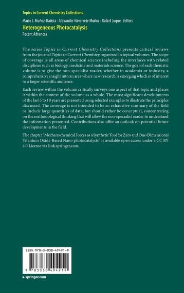 Waste-derived materials: Opportunities in photocatalysis.- Mechanochemical forces as a synthetic tool for zero and one-dimension titanium oxide based nano-photocatalysts.- Improvements in catalyst synthesis and photocatalytic oxidation processing based on the use of ultrasound.- Ferrite Materials for Photoassisted Environmental and Solar Fuels Applications.- Characterization of Photo-catalysts: from Traditional to Advanced Approaches.- Photocatalytic Approaches for Hydrogen Production via Formic Acid Decomposition.- Limitations and prospectives in wastewater treatment by UV and visible light active heterogeneous photocatalysis: a critical review.- Photocatalytic Reactor Modelling. Applications to Advanced Oxidation Processes for Chemical Pollution Abatement.