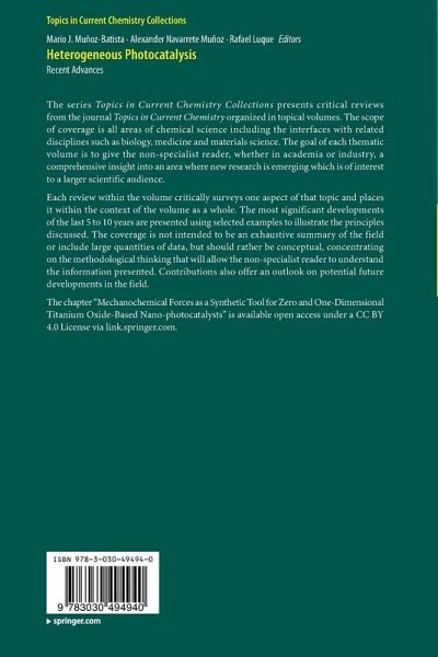 Waste-derived materials: Opportunities in photocatalysis.- Mechanochemical forces as a synthetic tool for zero and one-dimension titanium oxide based nano-photocatalysts.- Improvements in catalyst synthesis and photocatalytic oxidation processing based on the use of ultrasound.- Ferrite Materials for Photoassisted Environmental and Solar Fuels Applications.- Characterization of Photo-catalysts: from Traditional to Advanced Approaches.- Photocatalytic Approaches for Hydrogen Production via Formic Acid Decomposition.- Limitations and prospectives in wastewater treatment by UV and visible light active heterogeneous photocatalysis: a critical review.- Photocatalytic Reactor Modelling. Applications to Advanced Oxidation Processes for Chemical Pollution Abatement.