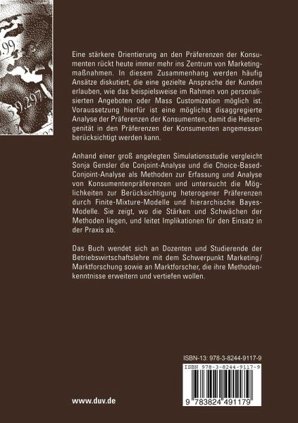 1 Einleitung.- 1.1 Problemstellung.- 1.2 Ziele der Arbeit.- 1.3 Aufbau der Arbeit.- 2 Präferenzerfassung und Präferenzanalyse mittels Conjoint Analyse und Choice-Based Conjoint Analyse.- 2.1 Nutzenkonstrukt und Präferenzen.- 2.2 Conjoint Analyse.- 2.3 Choice-Based Conjoint Analyse.- 2.4 Vergleich von Conjoint Analyse und Choice-Based Conjoint Analyse.- 2.5 Fazit.- 3 Möglichkeiten zur Modellierung von Heterogenität in der Präferenzanalyse.- 3.1 Bedeutung der Heterogenität.- 3.2 Modellierung von Heterogenität in Modellen auf aggregierter Ebene.- 3.3 Modellierung von Heterogenität in Modellen auf Segment-Ebene.- 3.4 Modellierung von Heterogenität in Modellen auf individueller Ebene.- 3.5 Beurteilung der unterschiedlichen Möglichkeiten zur Modellierung von Heterogenität in der Präferenzanalyse.- 3.6 Fazit.- 4 Segmentspezifische Präferenzanalyse mit Finite Mixture Modellen.- 4.1 Finite Mixture Conjoint Modell.- 4.2 Finite Mixture Choice-Based Conjoint Modell.- 4.3 Empirischer Vergleich der Finite Mixture Modelle.- 4.4 Fazit.- 5 Individuelle Präferenzanalyse mit Hierarchischen Bayes Modellen.- 5.1 Einführung in die Bayes-Statistik.- 5.2 Hierarchisches Bayes Conjoint Modell.- 5.3 Hierarchisches Bayes Choice-Based Conjoint Modell.- 5.4 Empirischer Vergleich der hierarchischen Bayes Modelle.- 5.5 Fazit.- 6 Vergleich von Finite Mixture Modellen und hierarchischen Bayes Modellen.- 6.1 Theoretischer Vergleich von Finite Mixture Modellen und hierarchischen Bayes Modellen.- 6.2 Empirischer Vergleich von Finite Mixture Modellen und hierarchischen Bayes Modellen.- 6.3 Vergleich von Finite Mixture Modellen und hierarchischen Bayes Modellen anhand von Simulationsstudien.- 7 Durchführung der Simulationsstudie.- 7.1 Ziele der Simulationsstudie.- 7.2 BerücksichtigteFaktoren in der Simulationsstudie.- 7.3 Generierung der Daten.- 7.4 Betrachtete Modelle.- 7.5 Gütemaße.- 8 Ergebnisse der Simulationsstudie.- 8.1 Einfluss des Modelltyps und der berücksichtigten Faktoren auf die Gütemaße.- 8.2 Beurteilung der Anpassungsgüte der Modelle.- 8.3 Beurteilung der Aufdeckung der Nutzenstruktur.- 8.4 Beurteilung der Prognosevalidität.- 8.5 Zusammenfassung der Ergebnisse.- 9 Zusammenfassung und Implikationen.- 9.1 Zusammenfassung.- 9.2 Implikationen.- Stichwortverzeichnis.