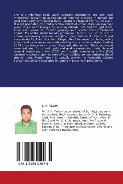This is a reference book which describes importance, use and basic information relevant to application of heterosis breeding in tomato for yield and quality contributing traits. Tomato is a tropical day neutral plant. It is self-pollinated crop but a certain extent of cross pollination may take place. It is a warm loving crop so easily tolerate heat and drought stress. India is the second top tomato growing country after China contributed about 11% of the World tomato production. Tomato is a rich source of antioxidants (mainly lycopene and beta-carotene), Vitamin A, Vitamin C and minerals like Ca, P and Fe in diet. Magnitude of heterosis, combining ability effects and its variances were estimated by line × tester analysis including 30 F1 cross combinations using 13 parents after selfing. These genotypes were evaluated for growth, yield and quality contributing traits. Ratio of general combining ability (GCA) and specific combining ability (SCA) variance revealed preponderance of non- additive genetic variances for all studied traits. Present book is basically written for Vegetable Science Scholar and persons interested in tomato improvement programme.