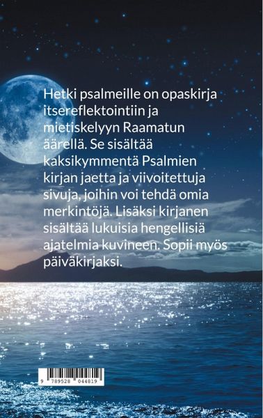 Hetki psalmeille on opaskirja itsereflektointiin ja mietiskelyyn Raamatun äärellä. Se sisältää kaksikymmentä Psalmien kirjan jaetta ja viivoitettuja sivuja, joihin voi tehdä omia merkintöjä. Lisäksi kirjanen sisältää lukuisia hengellisiä ajatelmia kuvineen. Sopii myös päiväkirjaksi.