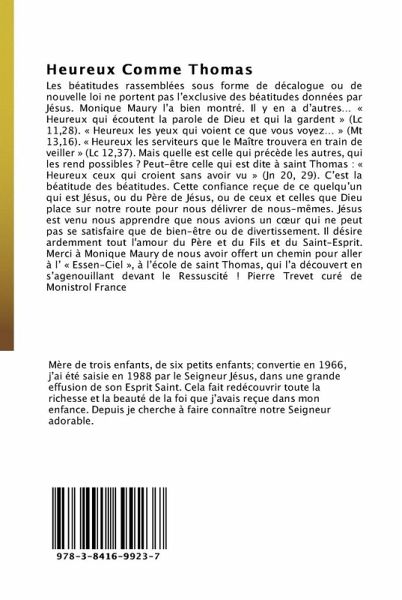 Les béatitudes rassemblées sous forme de décalogue ou de nouvelle loi ne portent pas l exclusive des béatitudes données par Jésus. Monique Maury l a bien montré. Il y en a d autres " Heureux qui écoutent la parole de Dieu et qui la gardent " (Lc 11,28). " Heureux les yeux qui voient ce que vous voyez " (Mt 13,16). " Heureux les serviteurs que le Maître trouvera en train de veiller " (Lc 12,37). Mais quelle est celle qui précède les autres, qui les rend possibles ? Peut-être celle qui est dite à saint Thomas : " Heureux ceux qui croient sans avoir vu " (Jn 20, 29). C est la béatitude des béatitudes. Cette confiance reçue de ce quelqu un qui est Jésus, ou du Père de Jésus, ou de ceux et celles que Dieu place sur notre route pour nous délivrer de nous-mêmes. Jésus est venu nous apprendre que nous avions un c ur qui ne peut pas se satisfaire que de bien-être ou de divertissement. Il désire ardemment tout l'amour du Père et du Fils et du Saint-Esprit. Merci à Monique Maury de nous avoir offert un chemin pour aller à l " Essen-Ciel ", à l école de saint Thomas, qui l a découvert en s agenouillant devant le Ressuscité ! Pierre Trevet curé de Monistrol France