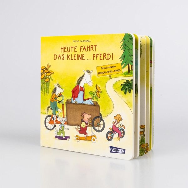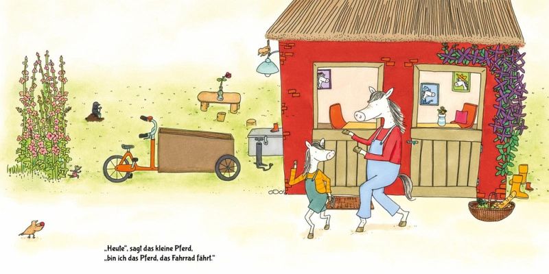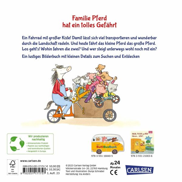 Familie Pferd hat ein tolles Gefährt! Ein Fahrrad mit großer Kiste! Damit lässt sich viel transportieren und wunderbar durch die Landschaft radeln. Und heute fährt das kleine Pferd das große Pferd. Los geht's! Wohin fahren die zwei? Und wer steigt unterwegs wohl noch mit ein?