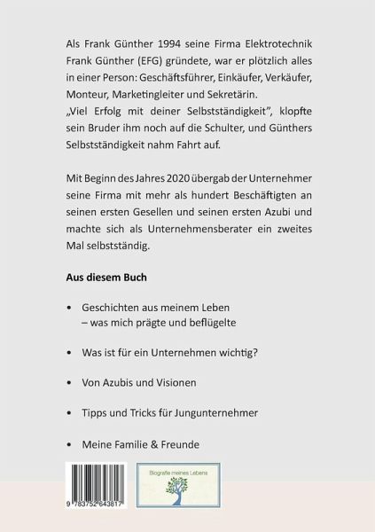 Als Frank Günther 1994 seine Firma Elektrotechnik Frank Günther gründete, war er plötzlich alles in einer Person: Geschäftsführer, Einkäufer, Verkäufer, Monteur, Marketingleiter und Sekretärin."Viel Erfolg mit deiner Selbstständigkeit", klopfte sein Bruder ihm noch auf die Schulter, und Günthers Selbstständigkeit nahm Fahrt auf. Mit Beginn des Jahres 2020 übergab der Unternehmer seine Firma mit mehr als hundert Beschäftigten an seinen ersten Gesellen und seinen ersten Azubi und machte sich als Unternehmensberater ein zweites Mal selbstständig.