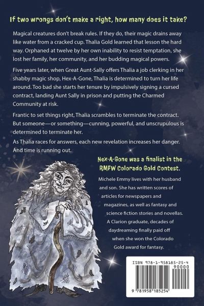 If two wrongs don't make a right, then how many does it take? Magical creatures don't break rules. If they do, their magic drains away like water from a cracked cup. Thalia Gold learned that lesson the hard way. Orphaned at twelve years old by her own inability to resist temptation, she lost her family, her community, and her budding magical powers. Five years later, when Great Aunt-Sally offers Thalia a job clerking in her shabby magic shop, Hex-A-Gone, Thalia is determined to turn her life around. Too bad she starts her tenure by impulsively signing a cursed contract, putting the entire Charmed Community under threat. Frantic to set things right, Thalia scrambles to terminate the contract. Turns out what happened to Thalia's family wasn't an accident-and someone-or something-cunning, powerful, and unscrupulous is determined to terminate her. Aided by former Middle Spell classmates and an assortment of unpredictable artifacts, Thalia races for answers. But each new revelation only adds to her danger. And time is running out. Hex-A-Gone is the first in this magical series and was a finalist in the RMFW Colorado Gold contest. In addition to fantasy, Michele Emmy writes science fiction and has been published in many magazines and journals.
