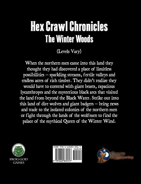 When the northern men came into this land they thought they had discovered a place of limitless possibilities - sparkling streams, fertile valleys, and endless acres of rich timber. They didn't realize that they would have to contend with giant beasts, rapacious lycanthropes, and the mysterious black arks that visited the land from beyond the Black Water. Strike out into this land of dire wolves and giant badgers - bring news and trade to the isolated colonies of the northern men or fight through the lands of the wolfmen to find the palace of the mythical Queen of the Winter Wind. Levels vary For Swords & Wizardry.