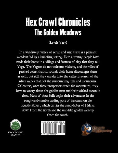 In a windswept valley of scrub and sand there is a pleasant meadow fed by a bubbling spring. Here a strange people have made their home in a village and fortress of clay that they call Vega. The Vegans do not welcome visitors, and the miles of parched desert that surrounds their home discourages them as well, but still they wander into the valley in search of the silver mines that dot the surrounding hills and mountains. Of course, once these prospectors reach the mountains, they have to worry about the goblin-men and their wicked moonlit rites. Most of these folk begin their adventures in the rough-and-tumble trading port of Sanctum on the Ruddy River, which carries the xenophobes of Halaya down from the north and the war-like golden men up from the south. Levels vary. For Swords & Wizardry.
