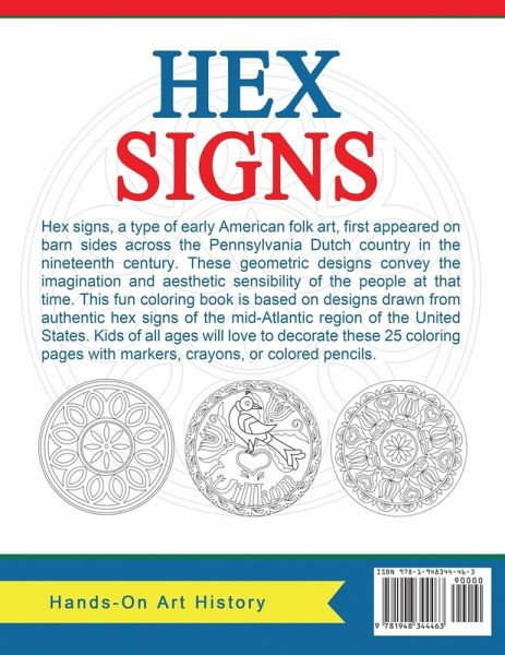 Hex signs, a type of early American folk art, first appeared on barn sides across the Pennsylvania Dutch country in the nineteenth century. These geometric designs convey the imagination and aesthetic sensibility of the people at that time. This fun coloring book is based on designs drawn from authentic hex signs of the mid-Atlantic region of the United States. Kids of all ages will love to decorate these 25 coloring pages with markers, crayons, or colored pencils.