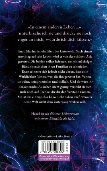 Hexed ist ein düsterer Liebesroman und der sechste, unabhängig lesbare, Teil der Never-After-Serie: einer Sammlung von gebrochenen Märchen, in denen die Bösewichte die Helden sind. Es handelt sich nicht um eine Nacherzählung. Hexed enthält Themen und Inhalte, die möglicherweise nicht für alle Leser:innen geeignet sind. Alle Warnhinweise zum Inhalt findet ihr auf der Webseite der Autorin.