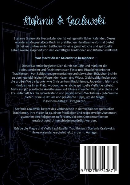 Stefanie Gralewskis Hexenkalender ist kein gewöhnlicher Kalender. Dieses wunderschön gestaltete Buch im praktischen Handtaschenformat bietet Dir einen umfassenden Leitfaden für eine ganzheitliche und spirituelle Lebensweise, inspiriert von den vielfältigen Traditionen und Ritualen weltweit. Was macht diesen Kalender so besonders? Dieser Hexenkalender begleitet Dich durch das Jahr und markiert die bedeutendsten und faszinierendsten Feste und Rituale heidnischer Traditionen - von keltischen, germanischen und slawischen Bräuchen bis hin zu den neuheidnischen Wegen der Hexen und Wicca. Gleichzeitig finden auch die großen Weltreligionen wie Christentum, Buddhismus, Judentum, Islam und Hinduismus ihren Platz, wodurch eine reiche spirituelle Vielfalt entsteht. Mehr als 350 praktische Anleitungen und Rituale erwarten Dich: Von Liebe und Freundschaft bis hin zu Wohlstand und persönlichem Wachstum - jede Woche bietet Dir neue Rituale und praktische Tipps, um die Magie in Deinem Alltag zu integrieren. Stefanie Gralewski betont das Verbindende in der Vielfalt der spirituellen Traditionen. Ihre Vision ist es, einen friedlichen und respektvollen Austausch zwischen den Religionen zu fördern, bei dem Gemeinsamkeiten entdeckt und Unterschiede gewürdigt werden. Erlebe die Magie und Vielfalt spiritueller Traditionen Stefanie Gralewskis Hexenkalender erscheint jetzt in der 11. Auflage.
