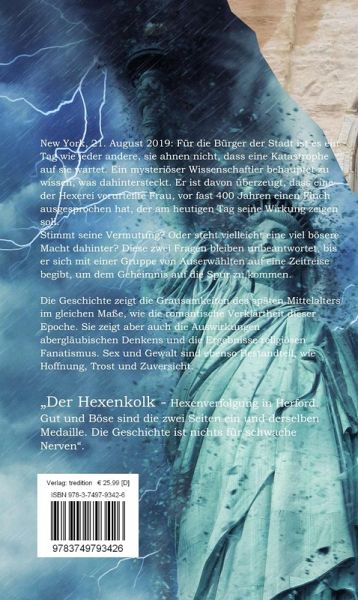 New York, 21. August 2019: Für die Bürger der Stadt istes ein Tag wie jeder andere, sie ahnen nicht, dass eineKatastrophe auf sie wartet. Dann erscheint einmysteriöser Wissenschaftler auf der Bildfläche undbehauptet, dass eine der Hexerei verurteilte Frau, vorfast 400 Jahren einen Fluch ausgesprochen hat, der amheutigen Tag seine Wirkung zeigen soll.Stimmt seine Vermutung? Oder steht vielleicht einebösere Macht dahinter? Diese zwei Fragen bleibenunbeantwortet, bis er sich mit einer Gruppe vonAuserwählten auf eine Zeitreise in mittelalterliche Europa begibt, um dem Geheimnis auf die Spur zu…mehr