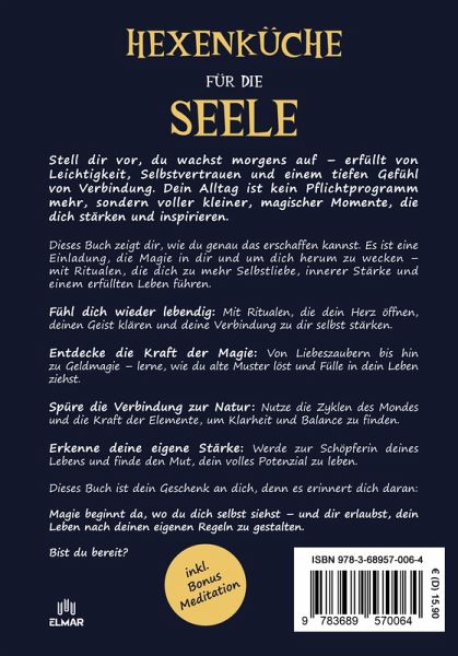 Stell dir vor, du wachst morgens auf - erfüllt von Leichtigkeit, Selbstvertrauen und einem tiefen Gefühl von Verbindung. Dein Alltag ist kein Pflichtprogramm mehr, sondern voller kleiner, magischer Momente, die dich stärken und inspirieren.Dieses Buch zeigt dir, wie du genau das erschaffen kannst. Es ist eine Einladung, die Magie in dir und um dich herum zu wecken - mit Ritualen, die dich zu mehr Selbstliebe, innerer Stärke und einem erfüllten Leben führen. Fühl dich wieder lebendig: Mit Ritualen, die dein Herz öffnen, deinen Geist klären und deine Verbindung zu dir selbst stärken. Entdecke die Kraft der Magie: Von Liebeszaubern bis hin zu Geldmagie - lerne, wie du alte Muster löst und Fülle in dein Leben ziehst. Spüre die Verbindung zur Natur: Nutze die Zyklen des Mondes und die Kraft der Elemente, um Klarheit und Balance zu finden. Erkenne deine eigene Stärke: Werde zur Schöpferin deines Lebens und finde den Mut, dein volles Potenzial zu leben.Dieses Buch ist dein Geschenk an dich, denn es erinnert dich daran:Magie beginnt da, wo du dich selbst siehst - und dir erlaubst, dein Leben nach deinen eigenen Regeln zu gestalten.Bist du bereit?