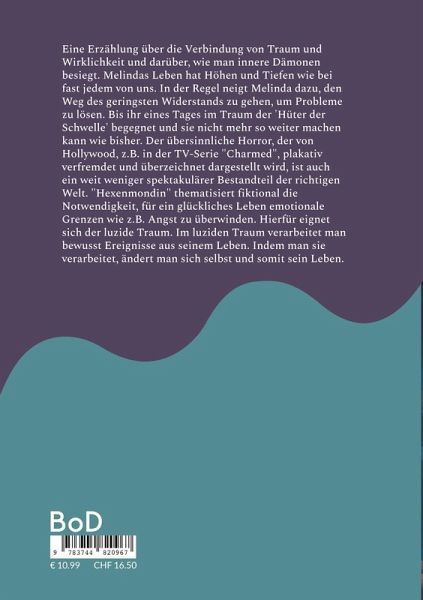 Eine Erzählung über die Verbindung von Traum und Wirklichkeit und darüber, wie man innere Dämonen besiegt. Melindas Leben hat Höhen und Tiefen wie bei fast jedem von uns. In der Regel neigt Melinda dazu, den Weg des geringsten Widerstands zu gehen, um Probleme zu beseitigen. Bis ihr eines Tages im Traum der 'Hüter der Schwelle' begegnet und sie nicht mehr so weiter machen kann wie bisher. "Hexenmondin" thematisiert die Notwendigkeit, für ein glückliches Leben emotionale Grenzen wie z.B. Angst zu überwinden. Hierfür eignet sich besonders der luzide Traum. Im luziden Traum verarbeitet man bewusst Ereignisse aus seinem Leben. Indem man sie verarbeitet, ändert man sich selbst und somit auch sein Leben.