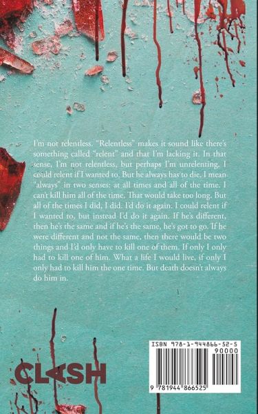 I'm not relentless. "Relentless" makes it sound like there's something called "relent" and that I'm lacking it. In that sense, I'm not relentless, but perhaps I'm unrelenting. I could relent if I wanted to. But he always has to die. I mean "always" in two senses: at all times and all of the time. I can't kill him all of the time. That would take too long. But all of the times I did, I did. I'd do it again. I could relent if I wanted to, but instead I'd do it again. If he's different, then he's the same and if he's the same, he's got to go. If he were different and not the same, then there would be two things and I'd only have to kill one of them. If only I only had to kill one of him. What a life I would live, if only I only had to kill him the one time. But death doesn't always do him in.