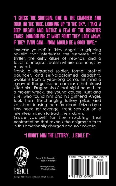 Perfect for fans of James Sallis's Drive, James O'Barr's The Crow, Ed Brubaker & Sean Phillips' Criminal, and Frank Miller's Sin City - Hey Angel is a haunting, emotionally raw neo-noir: a bruising, poetic descent through grief, revenge, and broken love, stitched together with rage, tenderness, trauma, and the shadow of lost love. "I check the shotgun, one in the chamber and four in the tube. Looking up to the sky, I take a deep breath and notice a few of the brighter stars, wondering at what point they look away, if they even can-now would be a good time." Frank - disgraced soldier, former brothel bouncer, and self-proclaimed deadsh*t - wakes from a year-long coma with a fractured mind and flashes of the car crash that nearly killed him. Haunted by glimpses of that night - a violent wreck, the young couple Kurt and Ellie, the stolen lottery winnings, and his bleeding girlfriend Angel - he sets out on a brutal path of retribution. Fueled by rage and memory, Frank embarks on a relentless hunt across shadowy streets and scarred landscapes in search of answers. What he finds will force him to confront not only the past but himself. Prepare for a raw, hypnotic novella of blood, ghosts, and ruin - and a final confrontation that cuts deep into the heart of who we are when there's nothing left to lose.