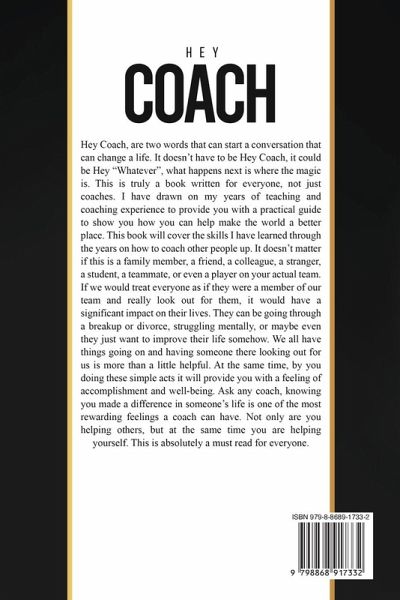 Hey Coach, are two words that can start a conversation that can change a life. It doesn't have to be Hey Coach, it could be Hey "Whatever", what happens next is where the magic is. This is truly a book written for everyone, not just coaches. I have drawn on my years of teaching and coaching experience to provide you with a practical guide to show you how you can help make the world a better place. This book will cover the skills I have learned through the years on how to coach other people up. It doesn't matter if this is a family member, a friend, a colleague, a stranger, a student, a teammate, or even a player on your actual team. If we would treat everyone as if they were a member of our team and really look out for them, it would have a significant impact on their lives. They can be going through a breakup or divorce, struggling mentally, or maybe even they just want to improve their life somehow. We all have things going on and having someone there looking out for us is more than a little helpful. At the same time, by you doing these simple acts it will provide you with a feeling of accomplishment and well-being. Ask any coach, knowing you made a difference in someone's life is one of the most rewarding feelings a coach can have. Not only are you helping others, but at the same time you are helping yourself. This is absolutely a must read for everyone.